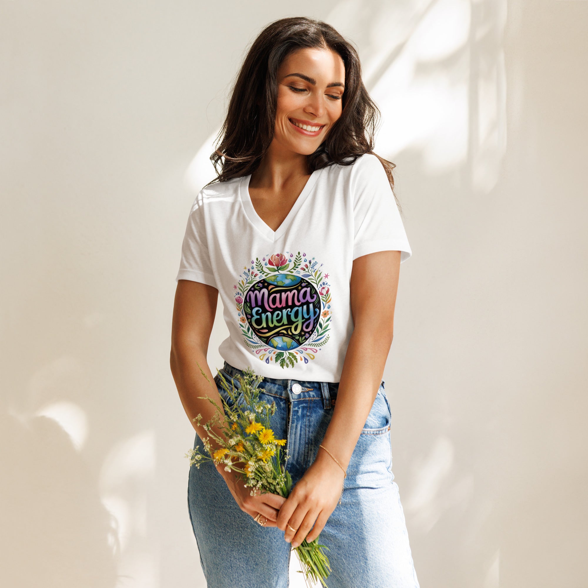 Mama Energy Shirt – Earthy V-Neck Mom Tee – Eco-Conscious Motherhood T-Shirt – Nature-Inspired Mama Gift – Relaxed Fit Feminine Tee